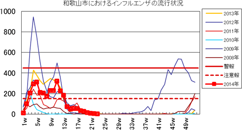 和歌山市内におけるインフルエンザの報告数は、2013年シーズンは、第42週1件、第45週3件、第46週2件、第47週1件、第49・50週3件、第51週6件、第52週40件ありました。2014年第1週11件、2週100件、3週205件、4週293件、5週313件と4週連続で増加しましたが、6週211件、7週205件、8週175と2週連続減少しました。9・10週は231件、11週は322件と再度増加しました。12週226件、13週182件、14週74件、15週48件と4週連続で減少しました。16週54件、17週53件、18週33件、19週27件、20週15件、21週7件、22週5件、23週2件(定点あたり0.13)と減少傾向です。発発生状況の詳細はこちらへ。