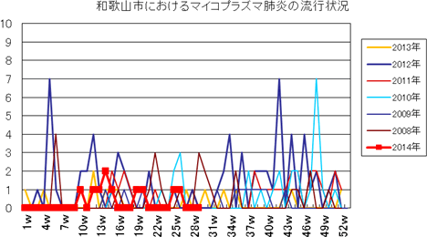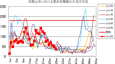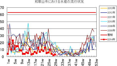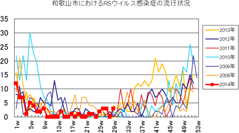 和歌山市の患者報告数は、2014年10週1件、12・13週1件、14週2件、第15週1件、第19週1件、第20週1件、第25・26週1件でした。2013年第2・3週は0件、第4週は1件、第5週以降は0件でしたが、第12週2件(定点あたり0.67)、第14・15・16週1件、第27週1件、第30・33週・35・43・44週1件、第52週1件(定点あたり0.33)の報告がありました。