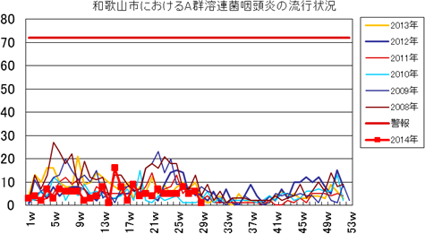 2013年第45週29件、第46週40件、第47週62件、第48週79件、第49週114件、第50週127件と5週連続で増加していましたが、第51週96件、第52週86件と減少しました。2014年第1週15件、2週70件、3週49件、4週76件、5週83件で、2週連続で増加しましたが、第6週は69件と前週より減少しました。第7週75件、第8週77件と2週連続増加しました。第9週は71件と前週より減少しましたが、第10週122件、第11週143件と増加しました。第12週113件、第13週87件、第14週57件と3週連続で減少しました。第15週59件、第16週78件、第17週131件と3週連続で増加しました。第18週118件、第19週113件、第20週142件、第21週125件、第22週117件、第23週75件で3週連続減少しました。24週は82件、25週59件、26週70件、27週56件、28週50件で、今週は38件(定点あたり4.22)と先週より減少しました。