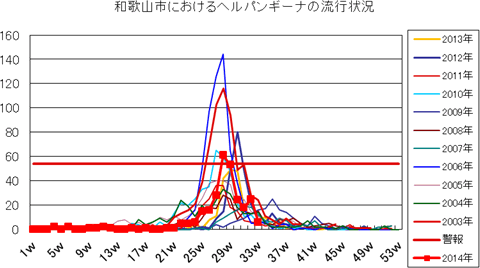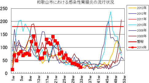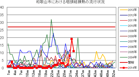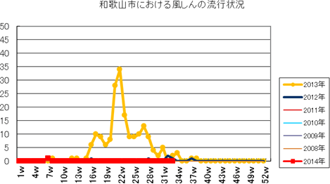 和歌山市の患者報告数は、2014年10週1件、12・13週1件、14週2件、第15週1件、第19週1件、第20週1件、第25・26週1件、第32週2件で、今週1件の報告がありました。2013年第2・3週は0件、第4週は1件、第5週以降は0件でしたが、第12週2件(定点あたり0.67)、第14・15・16週1件、第27週1件、第30・33週・35・43・44週1件、第52週1件(定点あたり0.33)の報告がありました。