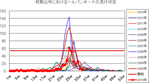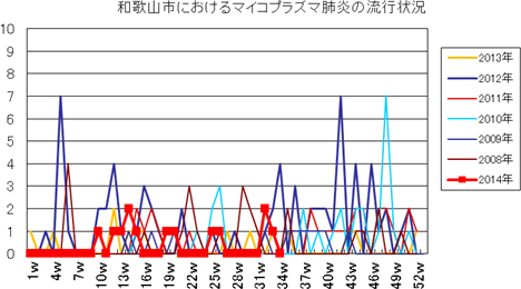 和歌山市の患者報告数は、2014年10週1件、12・13週1件、14週2件、第15週1件、第19週1件、第20週1件、第25・26週1件、第32週2件で、今週1件の報告がありました。2013年第2・3週は0件、第4週は1件、第5週以降は0件でしたが、第12週2件(定点あたり0.67)、第14・15・16週1件、第27週1件、第30・33週・35・43・44週1件、第52週1件(定点あたり0.33)の報告がありました。