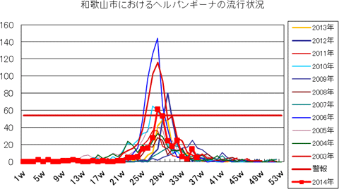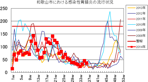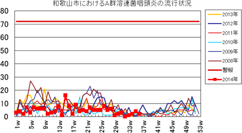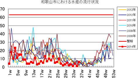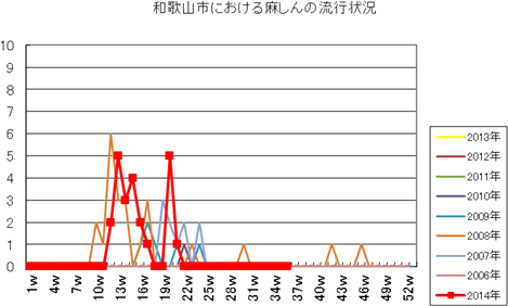 和歌山市の患者報告数は、2014年10週1件、12・13週1件、14週2件、第15週1件、第19週1件、第20週1件、第25・26週1件、第32週2件で、今週1件の報告がありました。2013年第2・3週は0件、第4週は1件、第5週以降は0件でしたが、第12週2件(定点あたり0.67)、第14・15・16週1件、第27週1件、第30・33週・35・43・44週1件、第52週1件(定点あたり0.33)の報告がありました。