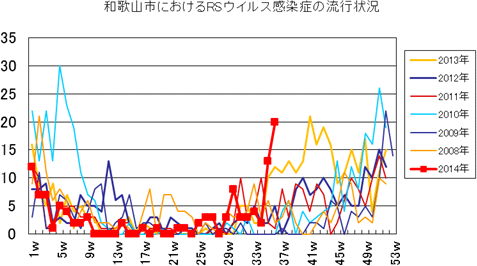 2014年第1週12件、第2・3週7件、第4週1件、第5週5件、第6週4件、第7週2件、第8週2件、第9週3件で、第10・11・12週0件、第13・14週は2件でした。第15・16週0件、第17週1件、第18週0件、第19週1件、第20・21週0件第22週1件、第23週1件、第25週2件、第26・27週3件、第28週0件、第29週3件、第30週8件で、第31・32週3件、第33週4件、第34週2件でしたが、第35週13件、第36週20件(定点あたり2.22)と急増しています。年齢別では2歳以下の小児が80%以上を占めています。