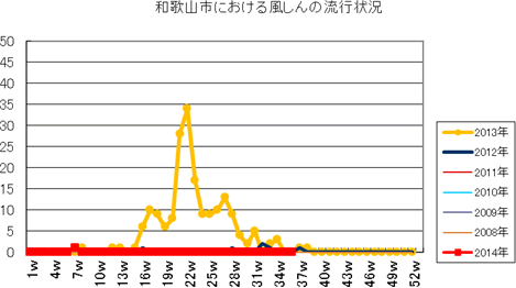 2013年第45週29件、第46週40件、第47週62件、第48週79件、第49週114件、第50週127件と5週連続で増加していましたが、第51週96件、第52週86件と減少しました。2014年第1週15件、2週70件、3週49件、4週76件、5週83件で、2週連続で増加しましたが、第6週は69件と前週より減少しました。第7週75件、第8週77件と2週連続増加しました。第9週は71件と前週より減少しましたが、第10週122件、第11週143件と増加しました。第12週113件、第13週87件、第14週57件と3週連続で減少しました。第15週59件、第16週78件、第17週131件と3週連続で増加しました。第18週118件、第19週113件、第20週142件、第21週125件、第22週117件、第23週75件で3週連続減少しました。24週は82件、25週59件、26週70件、27週56件、28週50件、29週38件、30週39件、31週34件、32週31件、33週24件、34週32件、35週46件で、今週は37件(定点あたり4.11)と先週より減少しました。