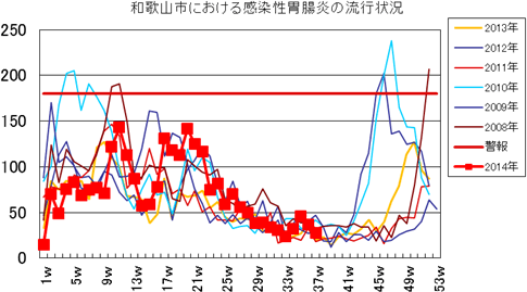 和歌山市の患者報告数は、2014年10週1件、12・13週1件、14週2件、第15週1件、第19週1件、第20週1件、第25・26週1件、第32週2件で、今週1件の報告がありました。2013年第2・3週は0件、第4週は1件、第5週以降は0件でしたが、第12週2件(定点あたり0.67)、第14・15・16週1件、第27週1件、第30・33週・35・43・44週1件、第52週1件(定点あたり0.33)の報告がありました。