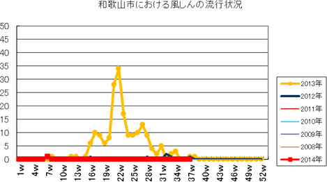 2013年第47・48週4件、第49週3件、第50週9件、第51週6件、第52週3件でした。2014年第1週3件、第2週4件、第3週2件、第4週7件、第5週3件、第6週7件、第7・8・9週6件でした。第10週2件、第11週3件、第12週4件、13週8件、第14週1件、第15週16件、第16週8件、第17週2件、第18週9件、第19週4件、第20週5件、第21週4件、第22週7件、第23・24・25週5件、第26週8件、第27週5件、第28週6件、第29週1件、第30週2件、第31週3件、第32週0件、第33週1件、第34週2件、第35週4件、第36週2件で、今週は5件(定点あたり0.56)と前週より増加しました。