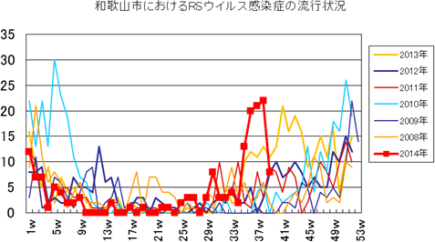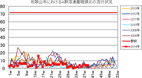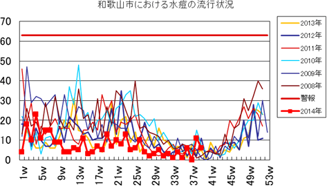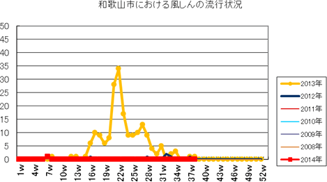 和歌山市の患者報告数は、2014年10週1件、12・13週1件、14週2件、第15週1件、第19週1件、第20週1件、第25・26週1件、第32週2件で、今週1件の報告がありました。2013年第2・3週は0件、第4週は1件、第5週以降は0件でしたが、第12週2件(定点あたり0.67)、第14・15・16週1件、第27週1件、第30・33週・35・43・44週1件、第52週1件(定点あたり0.33)の報告がありました。