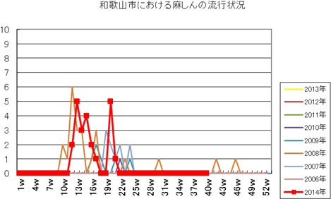 和歌山市の患者報告数は、2014年10週1件、12・13週1件、14週2件、第15週1件、第19週1件、第20週1件、第25・26週1件、第32週2件で、今週1件の報告がありました。2013年第2・3週は0件、第4週は1件、第5週以降は0件でしたが、第12週2件(定点あたり0.67)、第14・15・16週1件、第27週1件、第30・33週・35・43・44週1件、第52週1件(定点あたり0.33)の報告がありました。