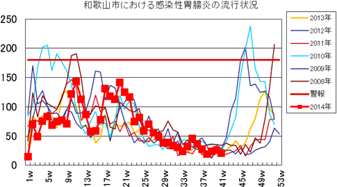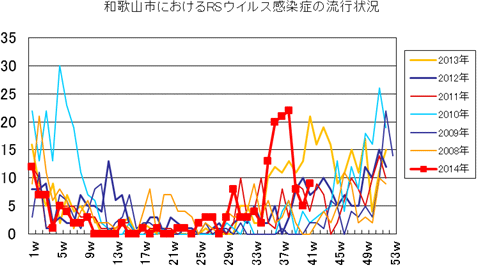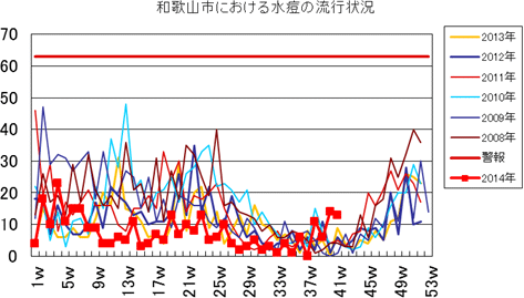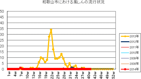 和歌山市の患者報告数は、2014年10週1件、12・13週1件、14週2件、第15週1件、第19週1件、第20週1件、第25・26週1件、第32週2件で、今週1件の報告がありました。2013年第2・3週は0件、第4週は1件、第5週以降は0件でしたが、第12週2件(定点あたり0.67)、第14・15・16週1件、第27週1件、第30・33週・35・43・44週1件、第52週1件(定点あたり0.33)の報告がありました。