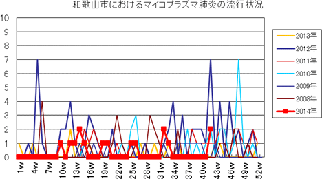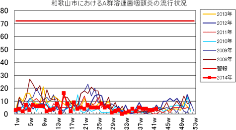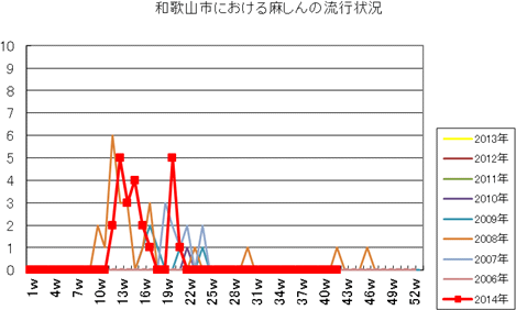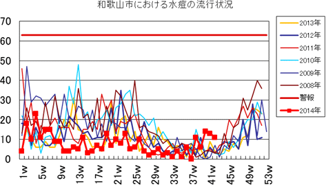 和歌山市の患者報告数は、2014年10週1件、12・13週1件、14週2件、第15週1件、第19週1件、第20週1件、第25・26週1件、第32週2件で、第33週1件、第42週2件の報告がありました。2013年第2・3週は0件、第4週は1件、第5週以降は0件でしたが、第12週2件(定点あたり0.67)、第14・15・16週1件、第27週1件、第30・33週・35・43・44週1件、第52週1件(定点あたり0.33)の報告がありました。