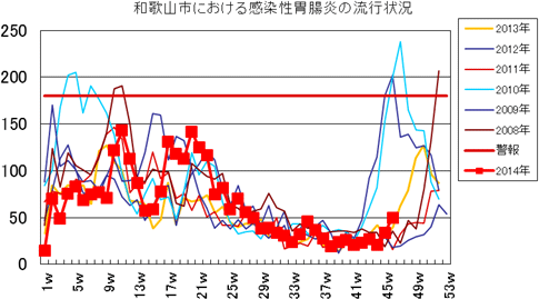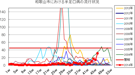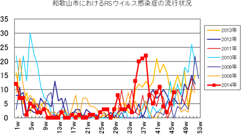和歌山市の患者報告数は、2014年10週1件、12・13週1件、14週2件、第15週1件、第19週1件、第20週1件、第25・26週1件、第32週2件で、第33週1件、第42週2件、第44週1件の報告がありました。2013年第2・3週は0件、第4週は1件、第5週以降は0件でしたが、第12週2件(定点あたり0.67)、第14・15・16週1件、第27週1件、第30・33週・35・43・44週1件、第52週1件(定点あたり0.33)の報告がありました。