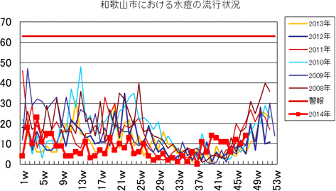 和歌山市の患者報告数は、2014年10週1件、12・13週1件、14週2件、第15週1件、第19週1件、第20週1件、第25・26週1件、第32週2件で、第33週1件、第42週2件、第44週1件の報告がありました。2013年第2・3週は0件、第4週は1件、第5週以降は0件でしたが、第12週2件(定点あたり0.67)、第14・15・16週1件、第27週1件、第30・33週・35・43・44週1件、第52週1件(定点あたり0.33)の報告がありました。