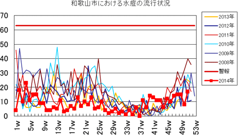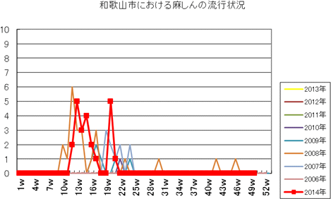和歌山市の患者報告数は、2014年10週1件、12・13週1件、14週2件、第15週1件、第19週1件、第20週1件、第25・26週1件、第32週2件で、第33週1件、第42週2件、第44週1件の報告がありました。2013年第2・3週は0件、第4週は1件、第5週以降は0件でしたが、第12週2件(定点あたり0.67)、第14・15・16週1件、第27週1件、第30・33週・35・43・44週1件、第52週1件(定点あたり0.33)の報告がありました。
