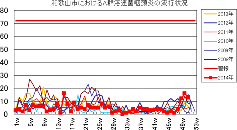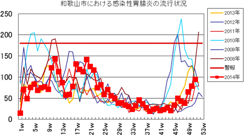 和歌山市内におけるインフルエンザの報告数は、2014年シーズンは、第46週2件、第47週1件、第48週7件、第49週13件、第50週58件、第51週158件(定点あたり10.5)と前週より大きく増加し、昨年より早い流行期入りです。発生状況の詳細はこちらへ。