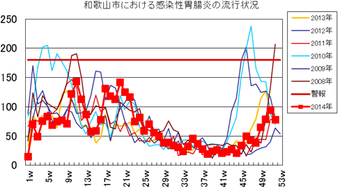 和歌山市内におけるインフルエンザの報告数は、2014年シーズンは、第46週2件、第47週1件、第48週7件、第49週13件、第50週58件、第51週158件で、今週481件(定点あたり32.1)と前週より大きく増加し、警報レベル基準値を超えました。全国的にも定点あたりの患者報告数は大きく増加しました(第51週:15.17)。発生状況の詳細はこちらへ。