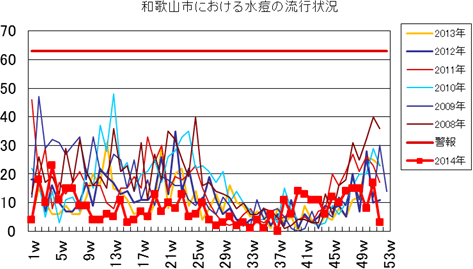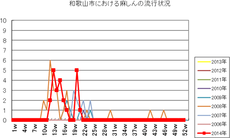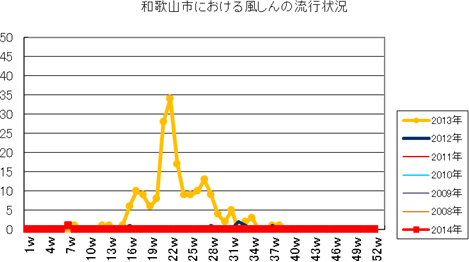 和歌山市の患者報告数は、2014年10週1件、12・13週1件、14週2件、第15週1件、第19週1件、第20週1件、第25・26週1件、第32週2件で、第33週1件、第42週2件、第44週1件の報告がありました。2013年第2・3週は0件、第4週は1件、第5週以降は0件でしたが、第12週2件(定点あたり0.67)、第14・15・16週1件、第27週1件、第30・33週・35・43・44週1件、第52週1件(定点あたり0.33)の報告がありました。