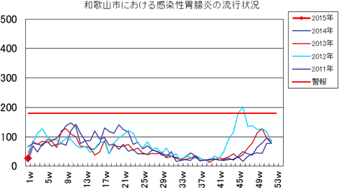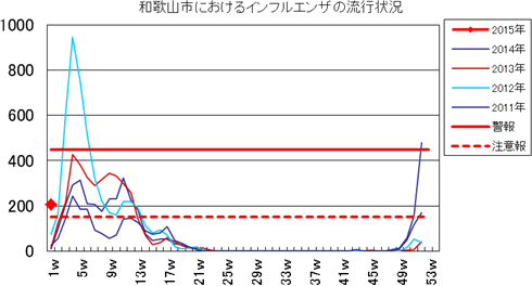 和歌山市内におけるインフルエンザの報告数は、2014年シーズンは、第46週2件、第47週1件、第48週7件、第49週13件、第50週58件、第51週158件で、第52週481件(定点あたり32.1)と前週より大きく増加し、警報レベル基準値を超えました。2015年今週も205件(定点あたり13.7)と警報レベル継続です。全国的にも定点あたりの患者報告数は大きく増加しました(第52週:26.63)。発生状況の詳細はこちらへ。