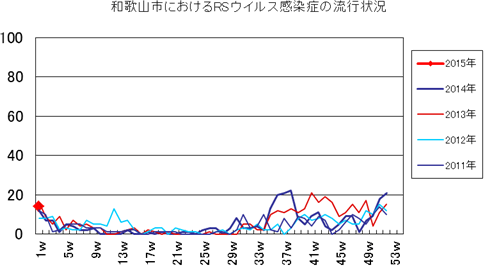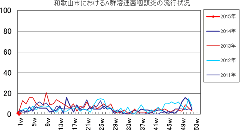 2014年41週21件、42週23件、43週27件、44週21件、45週34件、46週50件、47週43件、48週38件、49週65件、50週79件、51週95件、52週78件で、2015年今週は26件(定点あたり2.89)と先週より減少しました。