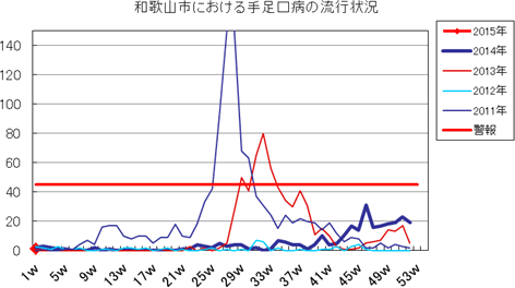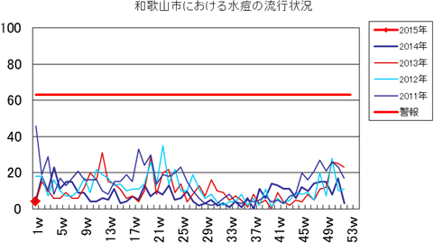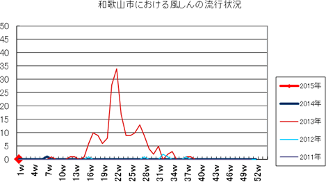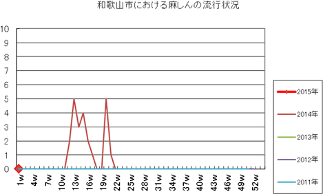 和歌山市の患者報告数は、2015年第1週1件の報告がありました。2014年は10週1件、12・13週1件、14週2件、第15週1件、第19週1件、第20週1件、第25・26週1件、第32週2件で、第33週1件、第42週2件、第44週1件の報告がありました。