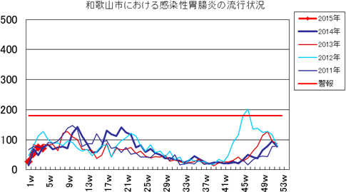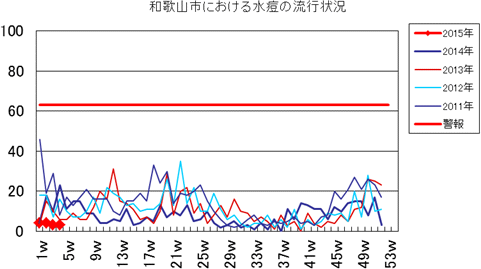 和歌山市内におけるインフルエンザの報告数は、2014年シーズンは、第46週2件、第47週1件、第48週7件、第49週13件、第50週58件、第51週158件で、第52週481件(定点あたり32.1)と前週より大きく増加し、警報レベル基準値を超えました。2015年1週205件、2週481件、3週450件、4週539件(定点あたり35.9)と警報レベル継続です。全国的にも定点あたりの患者報告数は増加し、第3週37.00でした。発生状況の詳細はこちらへ。