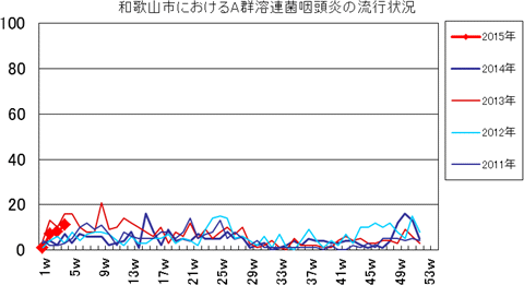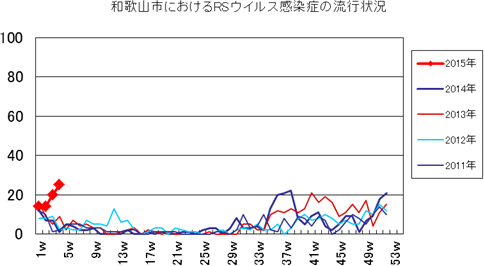 2014年第46・47週9件、第48週1件、第49週7件、第50週9件、第51週18件、第52週21件で、2015年第1週14件、第2週14件、第3週20件、第4週25件(定点あたり2.78)でした。過去5年間の同時期に比べ多い状況です。年齢別では2歳以下の小児が80%以上を占めています。