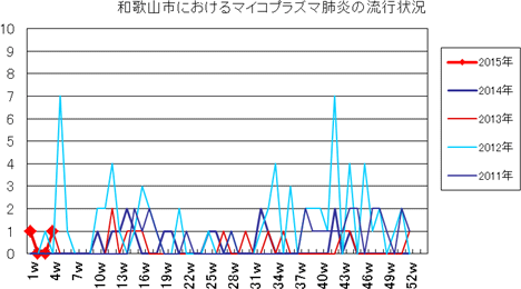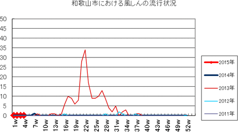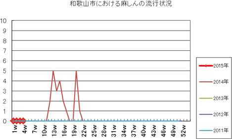 和歌山市の患者報告数は、2015年第1週1件、4週1件の報告がありました。2014年は10週1件、12・13週1件、14週2件、第15週1件、第19週1件、第20週1件、第25・26週1件、第32週2件で、第33週1件、第42週2件、第44週1件の報告がありました。
