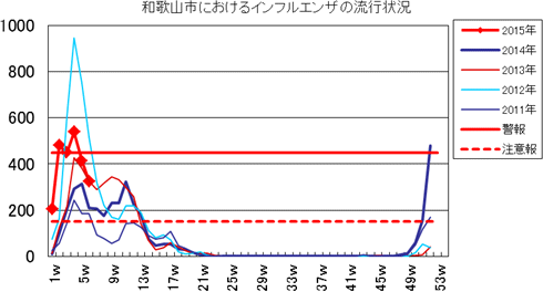 和歌山市内におけるインフルエンザの報告数は、2014年シーズンは、第46週2件、第47週1件、第48週7件、第49週13件、第50週58件、第51週158件で、第52週481件(定点あたり32.1)と前週より大きく増加し、警報レベル基準値を超えました。2015年1週205件、2週481件、3週450件、4週539件、5週414件、6週325件(定点あたり21.7)と警報レベル継続です。流行のピークは過ぎ、減少傾向です。全国的にも定点あたりの患者報告数は減少し、第5週29.11でした。発生状況の詳細はこちらへ。