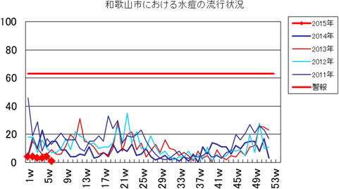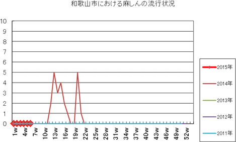 和歌山市の患者報告数は、2015年第1週1件、4週1件の報告がありました。2014年は10週1件、12・13週1件、14週2件、第15週1件、第19週1件、第20週1件、第25・26週1件、第32週2件で、第33週1件、第42週2件、第44週1件の報告がありました。