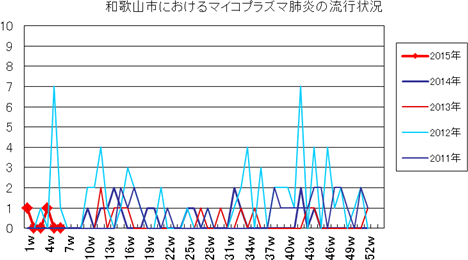 2014年第46・47週9件、第48週1件、第49週7件、第50週9件、第51週18件、第52週21件で、2015年第1週14件、第2週14件、第3週20件、第4週25件、第5週22件で、今週は16件(定点あたり1.78)でした。過去5年間の同時期に比べ多い状況です。年齢別では2歳以下の小児が80%以上を占めています。