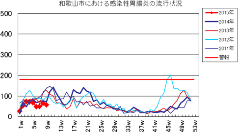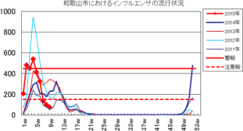 和歌山市内におけるインフルエンザの報告数は、2014年シーズンは、第46週2件、第47週1件、第48週7件、第49週13件、第50週58件、第51週158件で、第52週481件(定点あたり32.1)と前週より大きく増加し、警報レベル基準値を超えました。2015年1週205件、2週481件、3週450件、4週539件、5週414件、6週325件で、7週は133件となり警報解除です。8週99件で、今週は、72件(定点あたり4.8)と減少しました。流行のピークは過ぎ、減少傾向です。全国的にも定点あたりの患者報告数は減少し、第8週8.26でした。発生状況の詳細はこちらへ。