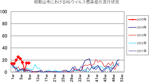 2014年第46・47週9件、第48週1件、第49週7件、第50週9件、第51週18件、第52週21件で、2015年第1週14件、第2週14件、第3週20件、第4週25件、第5週22件、第6週16件、第7週3件で、8・9週は15件(定点あたり1.67)と再度増加しました。過去5年間の同時期に比べ多い状況です。年齢別では2歳以下の小児が80%以上を占めています。