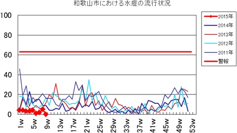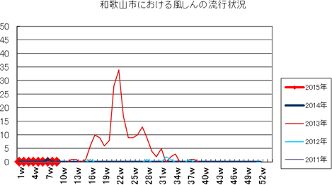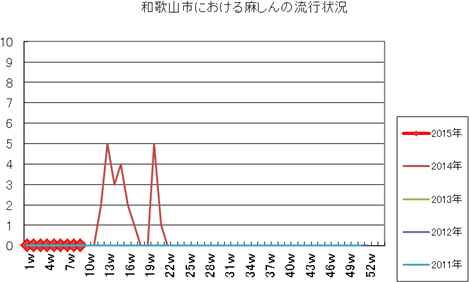 和歌山市の患者報告数は、2015年第1週1件、4週1件の報告がありました。2014年は10週1件、12・13週1件、14週2件、第15週1件、第19週1件、第20週1件、第25・26週1件、第32週2件で、第33週1件、第42週2件、第44週1件の報告がありました。