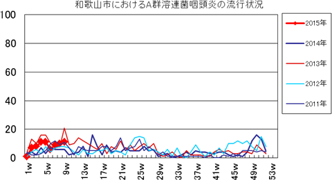 2014年第47週16件、第48週17件、第49週18件、第50週19件、第51週23件、第52週19件で、2015年1週1件、2週5件、3週2件、4週4件、5・6週1件、7週3件で、今週は1件(定点あたり0.11)でした。年齢別では6歳以下の小児がほぼ100%を占めています。