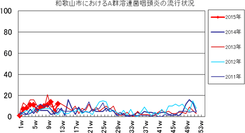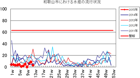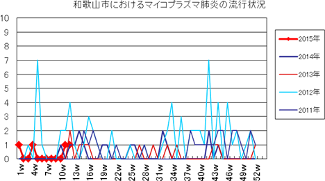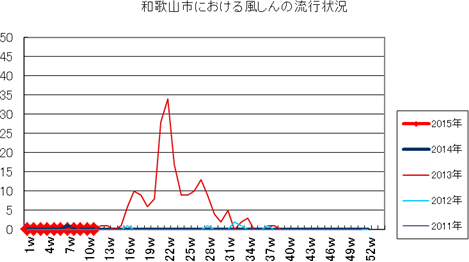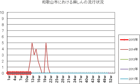和歌山市の患者報告数は、2015年第1週1件、4週1件、11・12週1件の報告がありました。2014年は10週1件、12・13週1件、14週2件、第15週1件、第19週1件、第20週1件、第25・26週1件、第32週2件で、第33週1件、第42週2件、第44週1件の報告がありました。
