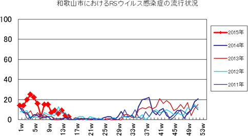 RSウイルス感染症は、13週9件、14週4件で、今週は3件(定点あたり0.33)と2週連続減少しました。過去5年間の同時期とほぼ同じ状況です。