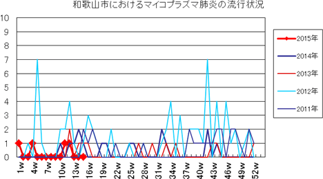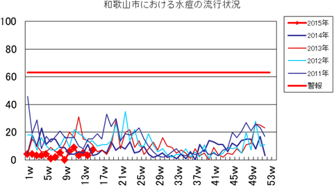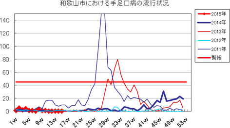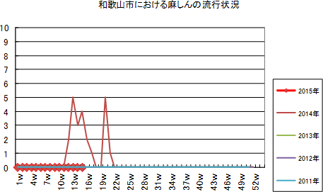 和歌山市の患者報告数は、2015年第1週1件、4週1件、11・12週1件の報告がありました。2014年は10週1件、12・13週1件、14週2件、第15週1件、第19週1件、第20週1件、第25・26週1件、第32週2件で、第33週1件、第42週2件、第44週1件の報告がありました。