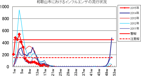 和歌山市内におけるインフルエンザの報告数は、2014年シーズンは、第46週2件、第47週1件、第48週7件、第49週13件、第50週58件、第51週158件で、第52週481件(定点あたり32.1)と前週より大きく増加し、警報レベル基準値を超えました。2015年1週205件、2週481件、3週450件、4週539件、5週414件、6週325件で、7週は133件となり警報解除です。8週99件、9週72件、10週71件、11週77件、12週76件、13週53件、14週45件、15週20件、16週21件、17週35件、18週21件で、今週は、11件(定点あたり0.73)と減少しました。流行は終息しました。発生状況の詳細はこちらへ。