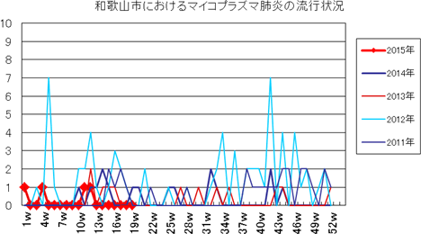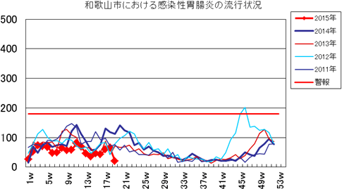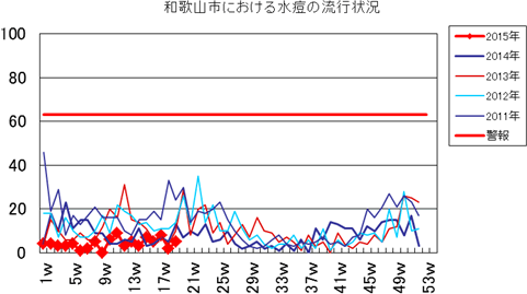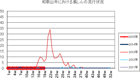 和歌山市の患者報告数は、2015年第1週1件、4週1件、11・12週1件の報告がありました。2014年は10週1件、12・13週1件、14週2件、第15週1件、第19週1件、第20週1件、第25・26週1件、第32週2件で、第33週1件、第42週2件、第44週1件の報告がありました。