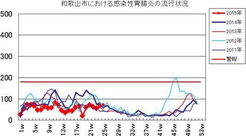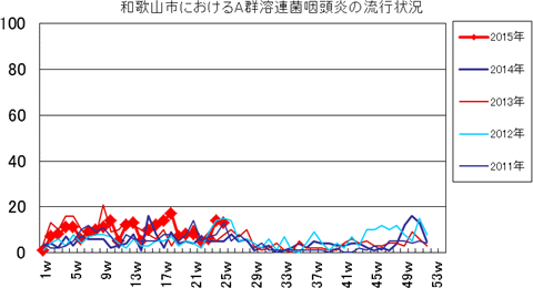 2015年1週26件、2週52件、3週74件、4週70件、5週68件、6週48件、7週49件、8週64件、9週57件、10週58件、11週81件、12週69件、13週47件、14週36件、15週47件、16週43件、17週60件、18週66件、19週21件、20週60件、21週72件、22週64件、23週55件、24週70件で、今週は67件(定点あたり7.44)と先週より減少しました。