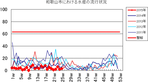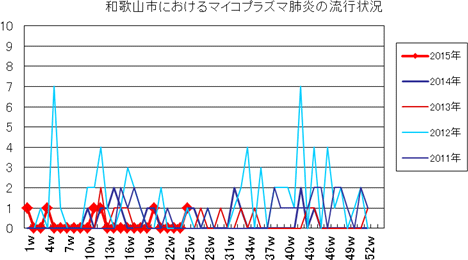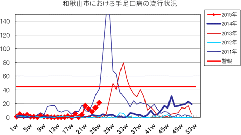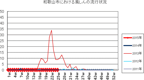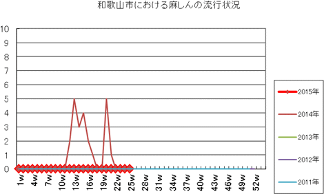 和歌山市の患者報告数は、2015年第1週1件、4週1件、11・12週1件、20週1件、25週1件の報告がありました。2014年は10週1件、12・13週1件、14週2件、第15週1件、第19週1件、第20週1件、第25・26週1件、第32週2件で、第33週1件、第42週2件、第44週1件の報告がありました。
