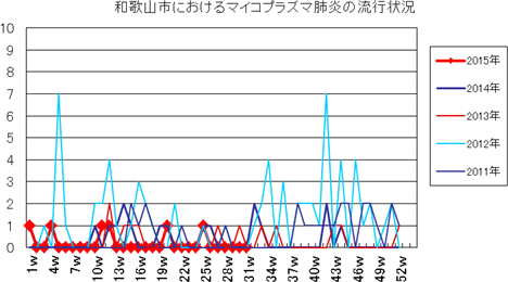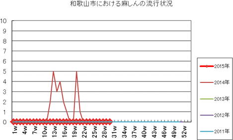 和歌山市の患者報告数は、2015年第1週1件、4週1件、11・12週1件、20週1件、25週1件の報告がありました。2014年は10週1件、12・13週1件、14週2件、第15週1件、第19週1件、第20週1件、第25・26週1件、第32週2件で、第33週1件、第42週2件、第44週1件の報告がありました。