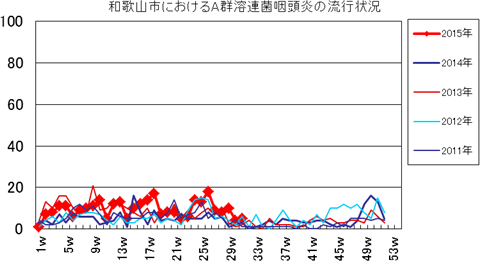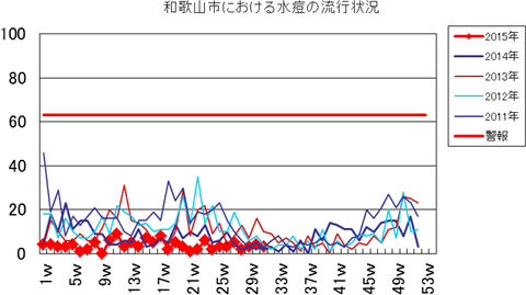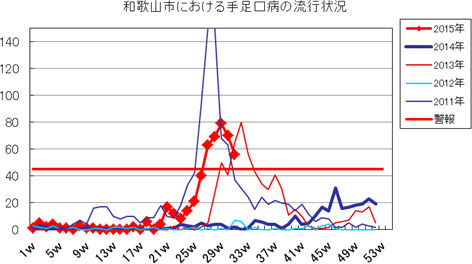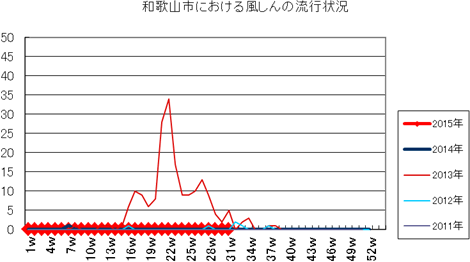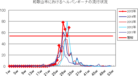 2015年第24週4件、第25週11件、第26週37件、第27週27件、第28週78件で、29週66件、30週54件(定点あたり6.00)と警戒レベルです。