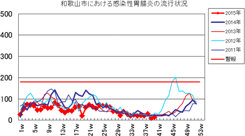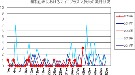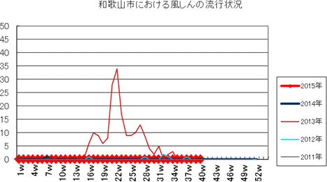 和歌山市の患者報告数は、2015年第1週1件、4週1件、11・12週1件、20週1件、25週1件、33週1件、40週3件の報告がありました。