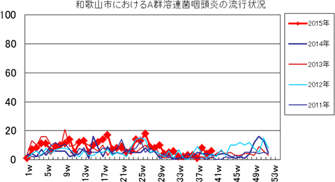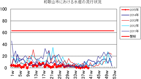 2015年1週26件、2週52件、3週74件、4週70件、5週68件、6週48件、7週49件、8週64件、9週57件、10週58件、11週81件、12週69件、13週47件、14週36件、15週47件、16週43件、17週60件、18週66件、19週21件、20週60件、21週72件、22週64件、23週55件、24週70件、25・26週67件、27週61件、28週42件、29週40件、30週22件、31週40件で、32週31件、33週21件、34週25件、35週21件、36週22件、37週21件、38週29件、39週10件、40週15件(定点あたり1.67)でした。