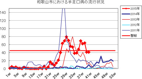2015年1週1件、2週5件、3週2件、4週4件、5・6週1件、7週3件、9・10週1件、11・12・13・14・15週0件、16週2件、17週0件、18週6件、19週0、20週4件、21週17件、22週12件、23週8件、24週14件、25週21件、26週40件、27週63件、28週69件で、29週79件、30週70件、31週56件、32週54件、33週38件、34週39件、35週48件、36週69件、37週62件、38週64件、39・40週41件(定点あたり4.56)で警報レベルです。年齢別では6歳以下の小児がほぼ100%を占めています