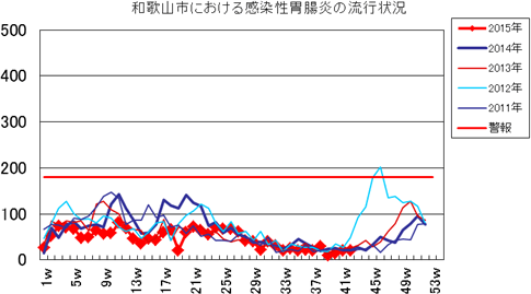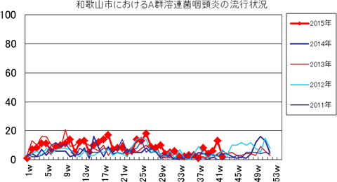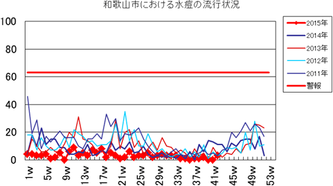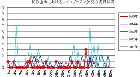 和歌山市の患者報告数は、2015年第1週1件、4週1件、11・12週1件、20週1件、25週1件、33週1件、40週3件、42週1件の報告がありました。