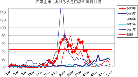 2015年1週1件、2週5件、3週2件、4週4件、5・6週1件、7週3件、9・10週1件、11・12・13・14・15週0件、16週2件、17週0件、18週6件、19週0、20週4件、21週17件、22週12件、23週8件、24週14件、25週21件、26週40件、27週63件、28週69件で、29週79件、30週70件、31週56件、32週54件、33週38件、34週39件、35週48件、36週69件、37週62件、38週64件、39・40週41件、41週26件でしたが、42週13件(定点あたり1.44)となり、警報は解除されました。年齢別では6歳以下の小児がほぼ100%を占めています