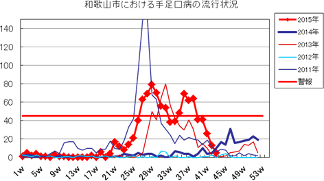 2015年1週1件、2週5件、3週2件、4週4件、5・6週1件、7週3件、9・10週1件、11・12・13・14・15週0件、16週2件、17週0件、18週6件、19週0、20週4件、21週17件、22週12件、23週8件、24週14件、25週21件、26週40件、27週63件、28週69件で、29週79件、30週70件、31週56件、32週54件、33週38件、34週39件、35週48件、36週69件、37週62件、38週64件、39・40週41件、41週26件でしたが、42週13件(定点あたり1.44)となり、警報は解除されました。43週は5件(定点あたり0.56)でした。年齢別では6歳以下の小児がほぼ100%を占めています