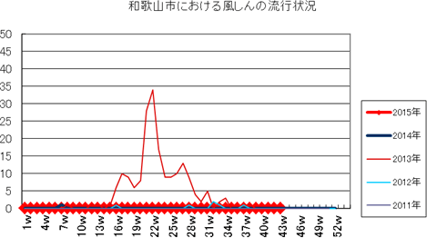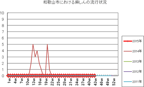 和歌山市の患者報告数は、2015年第1週1件、4週1件、11・12週1件、20週1件、25週1件、33週1件、40週3件、42週1件、43週2件の報告がありました。