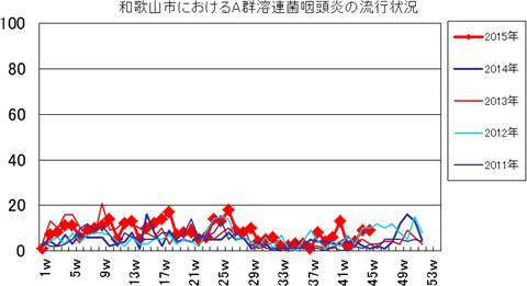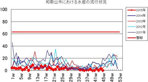 2015年1週26件、2週52件、3週74件、4週70件、5週68件、6週48件、7週49件、8週64件、9週57件、10週58件、11週81件、12週69件、13週47件、14週36件、15週47件、16週43件、17週60件、18週66件、19週21件、20週60件、21週72件、22週64件、23週55件、24週70件、25・26週67件、27週61件、28週42件、29週40件、30週22件、31週40件で、32週31件、33週21件、34週25件、35週21件、36週22件、37週21件、38週29件、39週10件、40週15件で、41週21件、42週20件、43週22件、44週32件、45週69件(定点あたり7.69)でした。